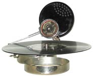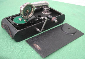 The Swiss-made Mikiphone was patented by the Vadász brothers in 1924 and resembles a large pocket watch when folded. The arrangement of the packing is ingenious with the turntable having holes to accept parts of the sound box whose diaphragm is not on the usual side. The resonator, which is used in place of a horn, is in two pieces which fit concave to concave sides. A spring clamp is used to hold the record securely on the small turntable.